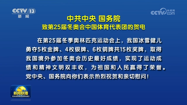 中共中央 国务院致第25届冬奥会中国体育代表团的贺电
