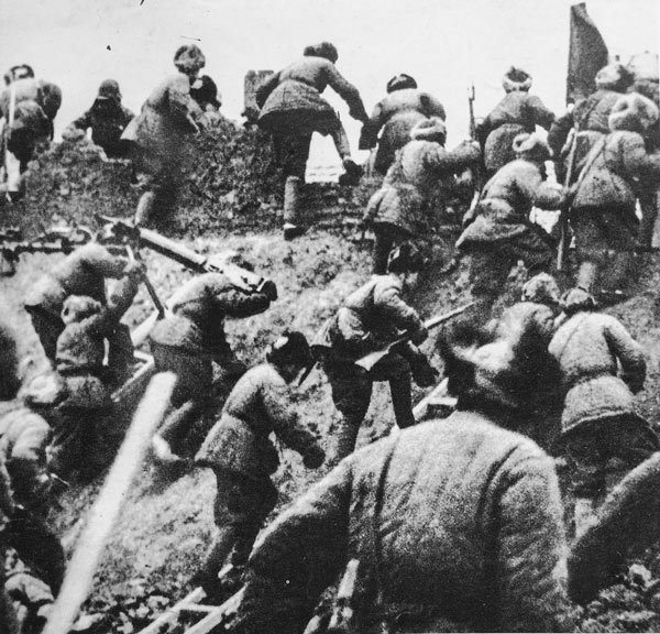 东北野战军第3纵队19团1连率先突破城垣,将红旗插上城垣。图为勇士们向突破口冲击。