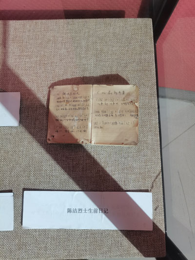 后来战友们在陈洁的遗物中还发现了一本战地日记。在日记中,她这样写道:“从今天起,我永远不会忘记我是一名共产党员,我懂得今后应该怎样为党工作,怎样奉献我的终身。”看着纪念馆里陈列的陈洁的照片,仿佛又让我们回到了那个战火纷飞的年代,又听到了她的歌声。这个爱唱爱跳的姑娘,为了千百万“喜儿”的幸福,牺牲了自己。这正是共产党员不变的本色。
